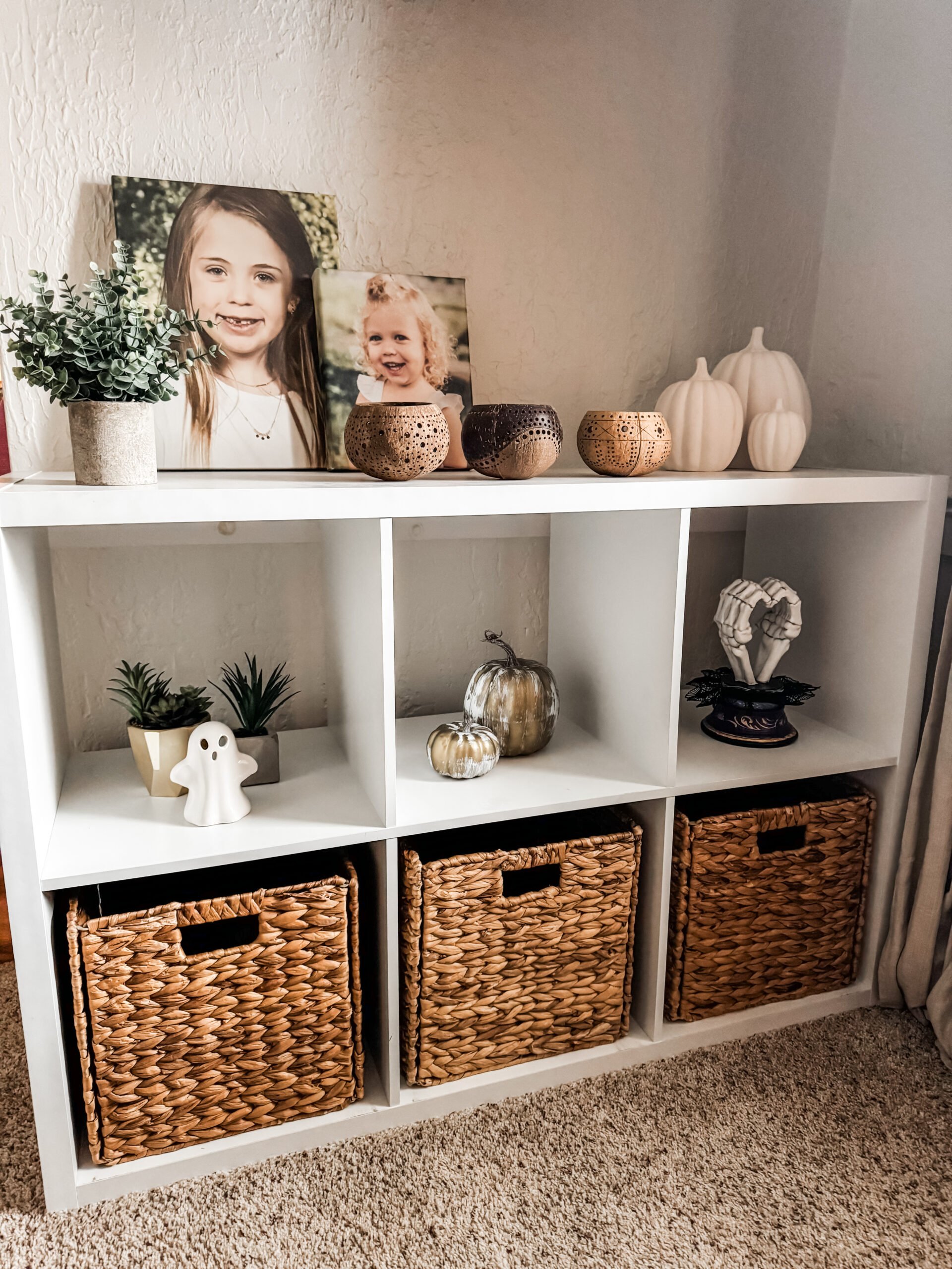 I styled our cube shelf with just a few neutral Halloween pieces: a tiny ghost candle holder, soft-toned pumpkins, and skeleton heart hands.